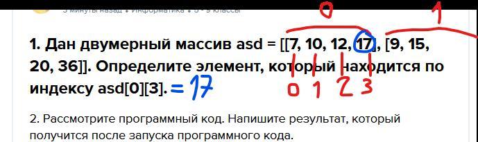 1. Дан двумерный массив asd = [[7, 10, 12, 17], [9, 15, 20, 36]]. Определите элемент, который находится по индексу asd[0][3].