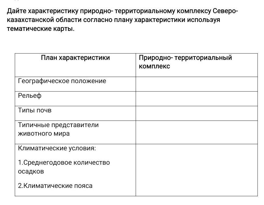 Дайте характеристику природно- территориальному комплексу Северо- казахстанской области согласно плану характеристики используя тематические карты.