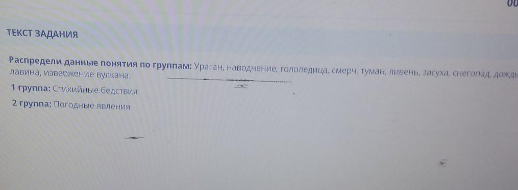 Распредели данные понятия по группам: Ураган, наводнение, гололедица, смерч, туман, ливень, засуха, снегопад, дождь,