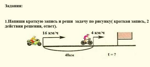 V1=16км/ч V2=4км/ч S=48км t=?ч 1)16-4=12(км/ч)Vсбл 2)48:12=4(ч)t Ответ:4ч