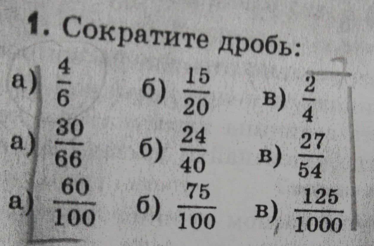 А)4/6=2/3. Б)15/20=3/4. В) 2/4=1/2. А)30/66= 5/11. Б) 24/40= 3/5. В) 27/54=1/2. А)60/100=3/5. Б) 75/100. В) 125/1000 =1/8
