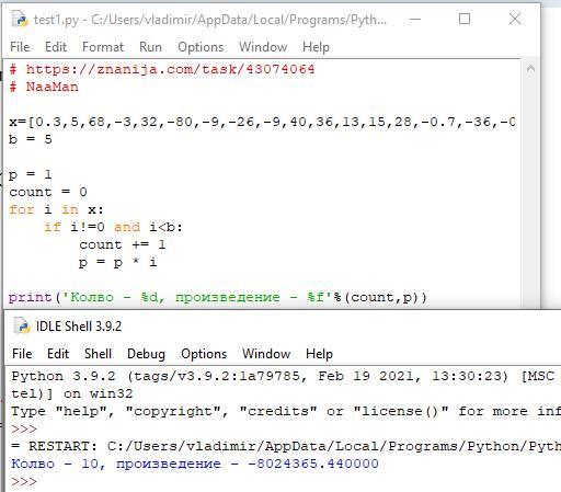 Составить блок-схему алгоритма и программу для обработки массива из 20 чисел X=(0,3;5;68;-3;32;-80;-9;-26;-9;40;36;13;15;28;-0,7;-36;-0,3;8;15;-7) при b=5. Вычислить произведение и количество элементов, не равных нулю и меньших b.