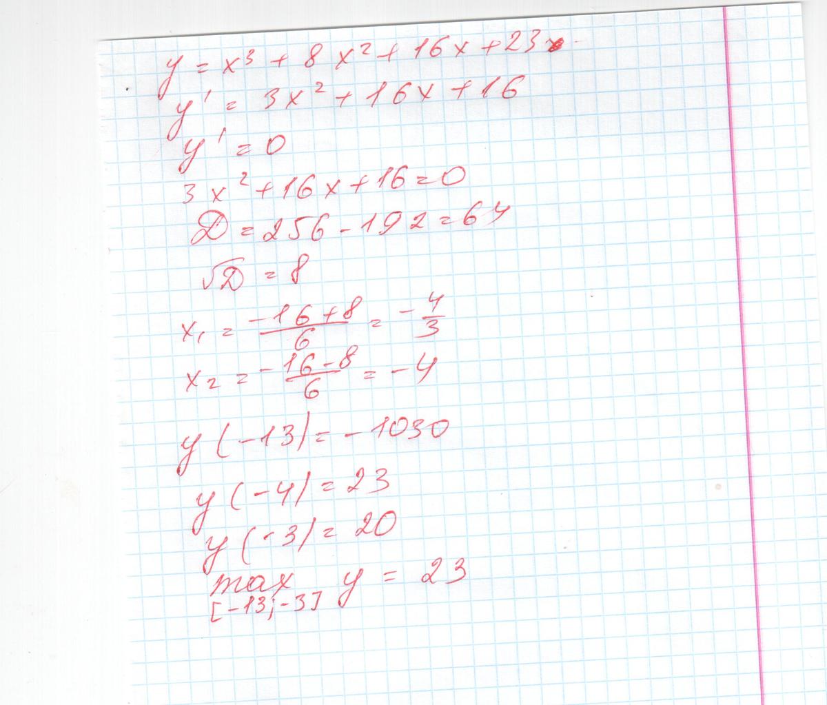 Найдите наибольшее значение функцииНайдите наибольшее значение функции y=x^3+8x^2+16x+23 на отрезке [-13;-3]