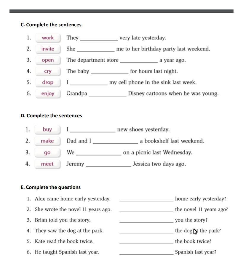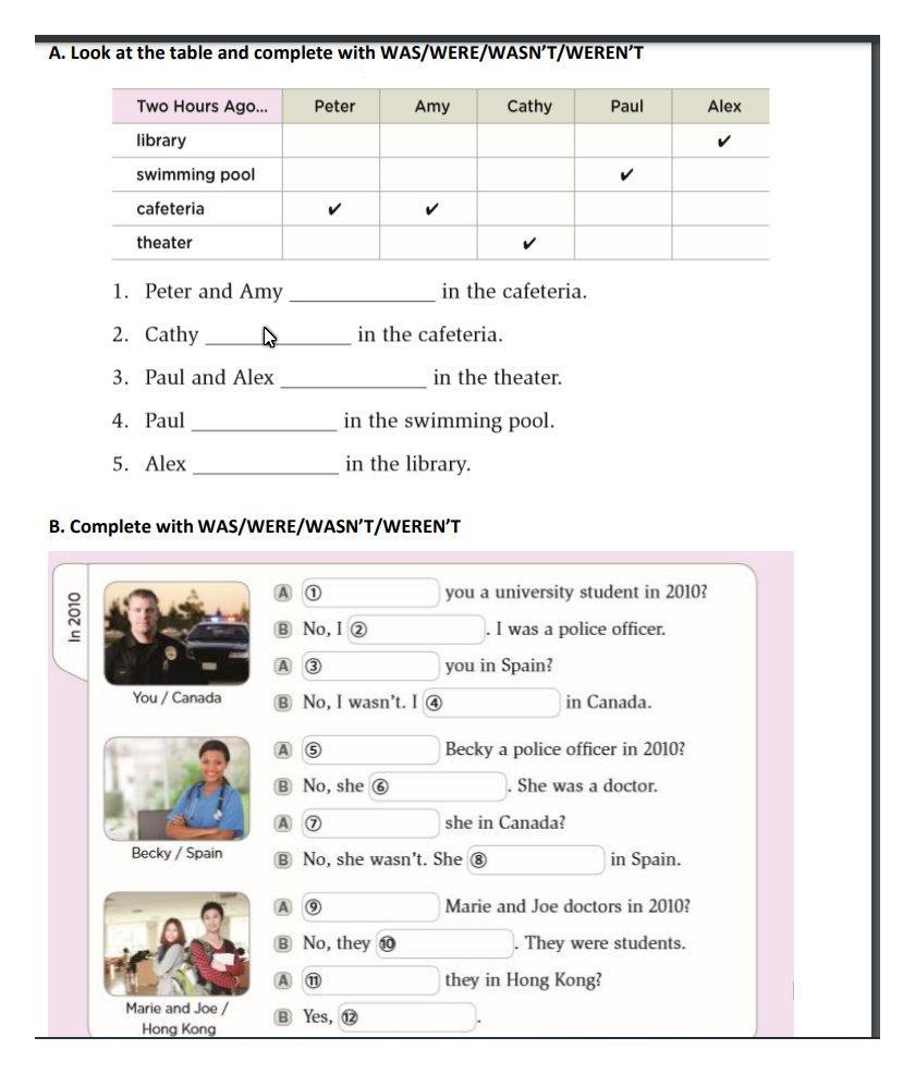 ПОМОГИЕ ПОЖАЛУЙСТА!!! СРОЧНО!!! ВСЕ ЗАДАНИЯ ПРИКРЕПИЛ!!! №1- А. Look at the table and complete with WAS/WERE/WASN’T/WEREN’T , №2-B. Complete with WAS/WERE/WASN’T/WEREN’T, №3- C. Complete the sentences, №4-E. Complete the questions ВСЕ ФОТКИ ПРИКРЕПИЛ.... СРОЧНО ПОМОГИТЕ !!!!!! ДАМ 40 БАЛЛОВ!!!!