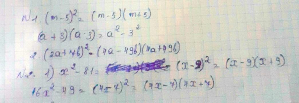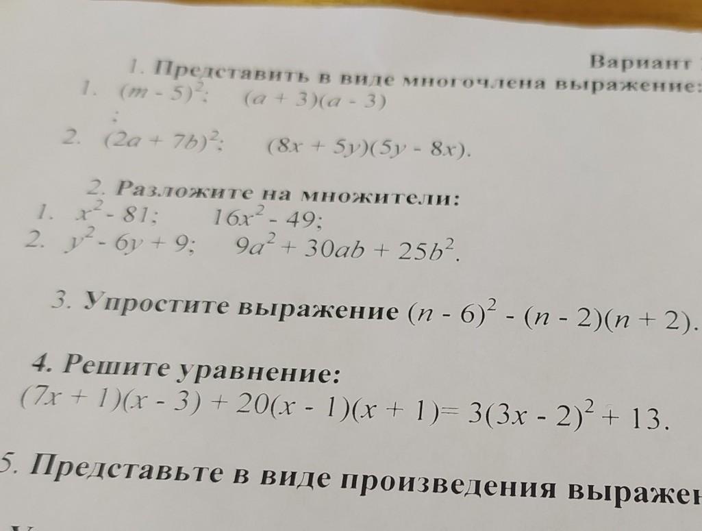 №1 1) 1. (m-5)²=m²-10m+25 2. (a+3)(a-3)=a²-3²=a²-9 2) 1. (2a+7b)²=4a+28ab+49b² 2. (8x+5y)(5y-8x)=25y²-64x² №2 1) 1. x²-81= (x-9)(x+9) 2. 16x²-49=(4x-7)(4x+7) 2) 1. y²-6y+9=(y-3)² 2. 9a²+30ab+25b²=(3a+5b)² №3 (n-6)²-(n-2)(n+2)=n²-12n+36-(n²-4)=n²-12n+36-n²+4=-12n+36+4=-12n+40 №4 (7x+1)(x-3)+20(x-1)(x+1)=3(3x-2)²+13 7x²-21+x-3+20(x²-1)=3(9x-12x+4)+13 7x²-21+x-3+20x²-20=27x-36x+12+13 27x²-20x-23=27x-36x+25 -20x-23=-36x+25 -20x+36x=25+23 16x=48 x=3