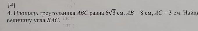 Площадь треугольника АВС равна 6√3. АВ = 8 см АС = 3см. Найди величину угла ВАС