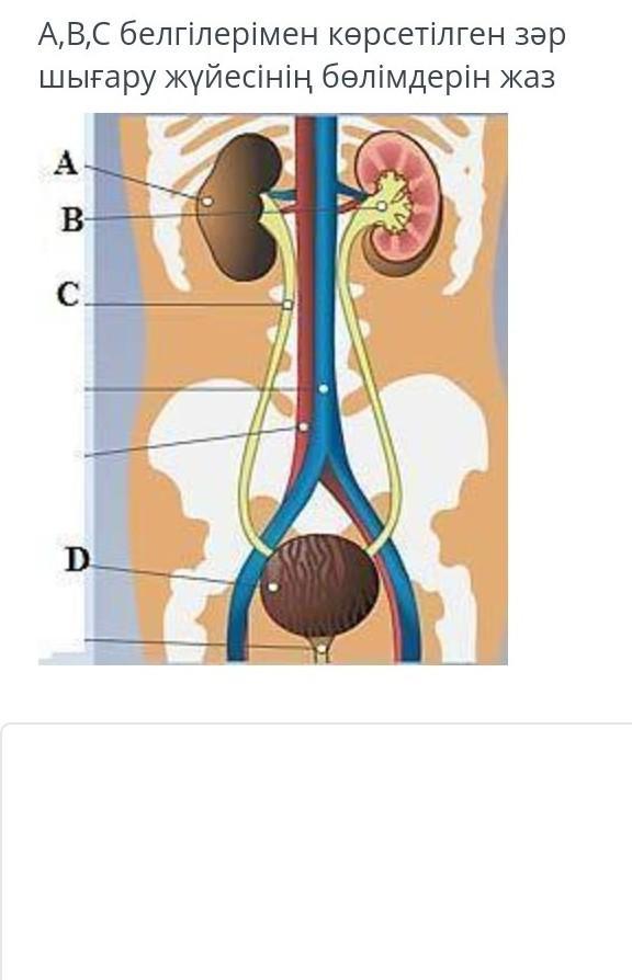 a-правая почка, b-левая почка, c-мочеточники, d-мочевой пузырь, e-артерия, f-мочеиспускательный канал, g-нижняя полая вена.