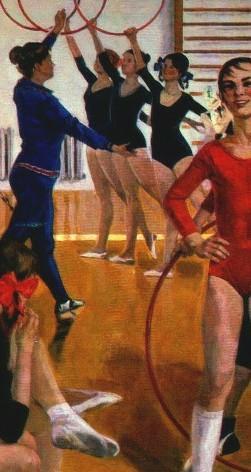 На картине А.В. Сайкиной «Детская спортивная школа» изображены девочки, которые занимаются гимнастикой. Обстановка в спортивном зале стандартная для тех времен, а костюмы девочек почти одинаковые. Они лишь немного отличаются расцветкой.