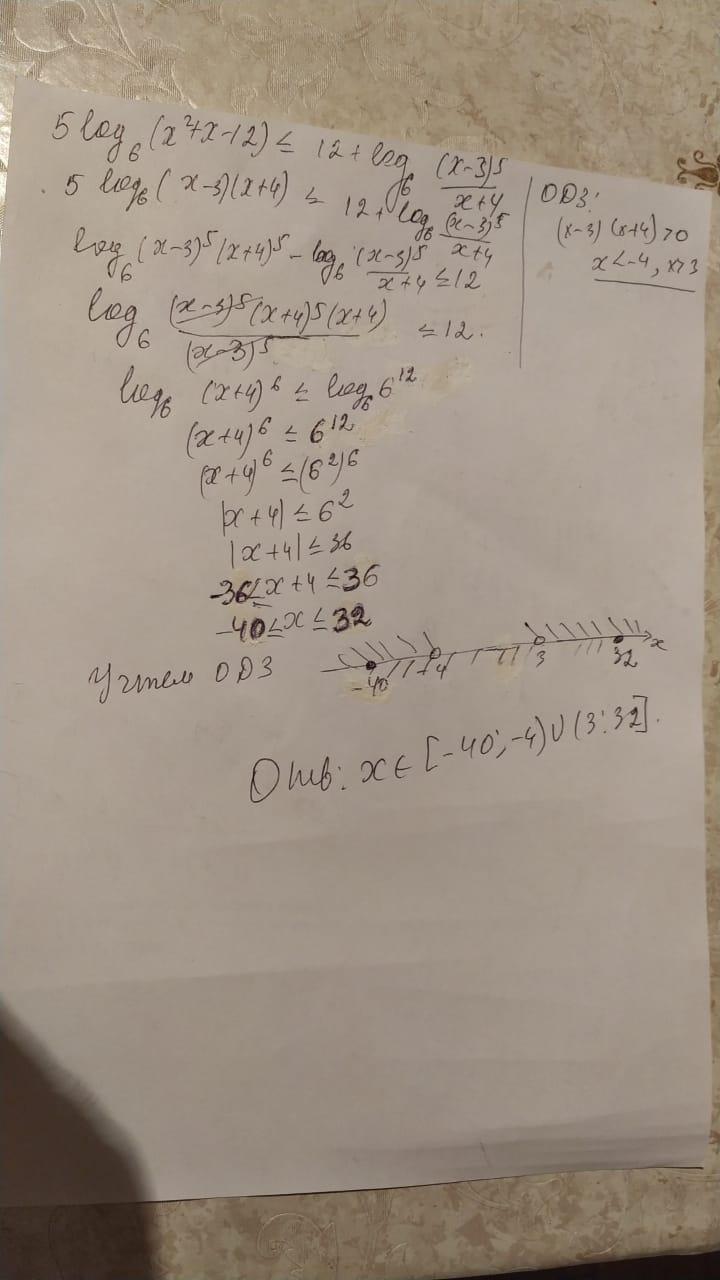 log₆(x²+x-12)⁵-log₆(x-3)⁵/(x+4)<=6¹²