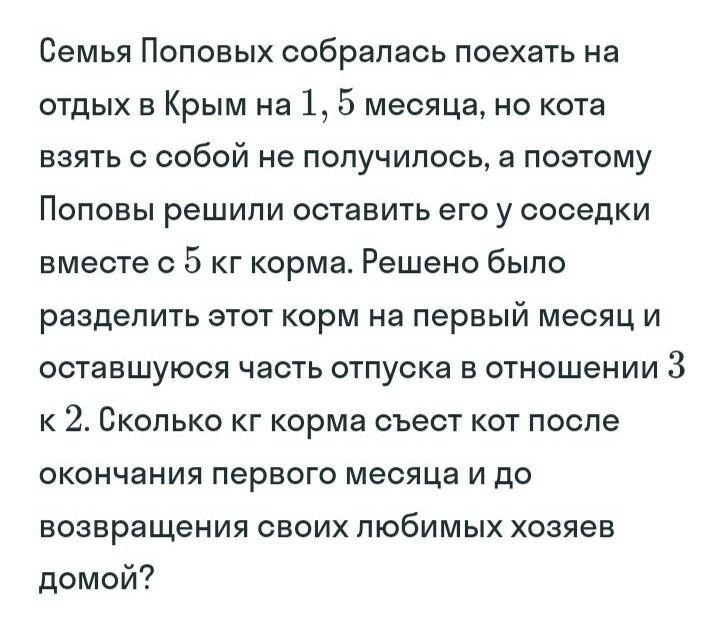 Кот съест 2x = 2 * 1 = 2 кг корма после окончания первого месяца и до возвращения хозяев.