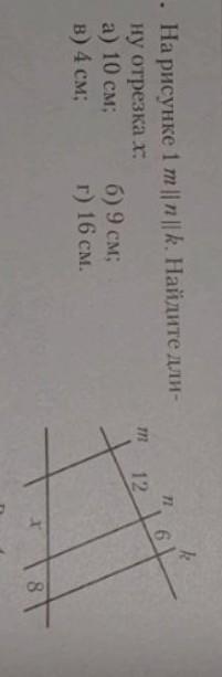 На рисунке 1m || n || k. Найдите длину отрезка x. а) 10 см, б) 9 см, в) 4 см, г) 16 см