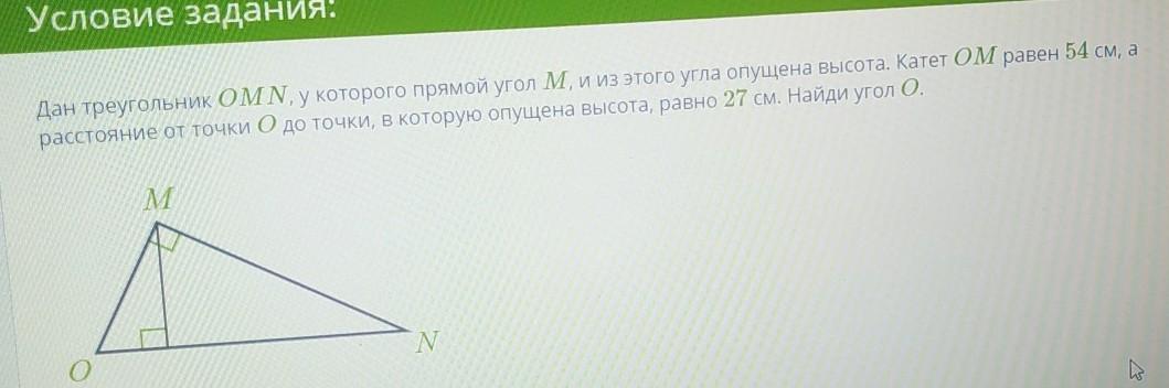 Рассмотрим треугольник OMH (OH=27):он прямоугольный ,и так как катет OH равен половине гипотенузы OM, угол ОМН=30(по теореме),угол О=90-30=60