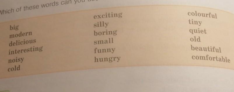 Big brain;modern house; delicious food; interesting story; noisy people; cold weather; exciting news; silly friend; boring lesson; small country; funny situation; hungry boy; colorful notebook; tiny dress; quit baby; old woman; beautiful lady; comfortable chair