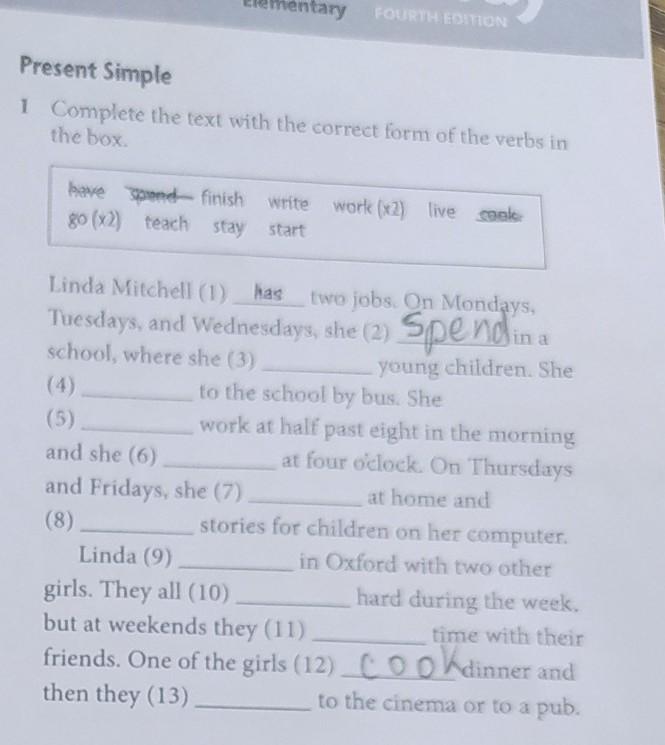 has правильно, вместо spend - works, далее teaches, goes,starts, finishes, stays, writes, lives, work, spend, cooks,go