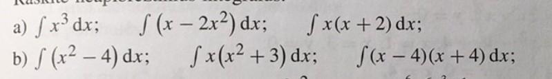 a)\ \ \int x^3\, dx=\dfrac{x^4}{4}+C\\\\\int (x-2x^2)\, dx=\dfrac{x^2}{2}-2\cdot \dfrac{x^3}{3}+C\\\\\int x(x+2)\, dx=\int (x^2+2x)\, dx=\dfrac{x^3}{3}+2\cdot \dfrac{x^2}{2}+C=\dfrac{x^3}{3}+x^2+C\\\\\\b)\ \ \int (x^2-4)\, dx=\dfrac{x^3}{3}-4x+C\\\\\int x(x^2+3)\, dx=\int (x^3+3x)\, dx=\dfrac{x^4}{4}+3\cdot \dfrac{x^2}{2}+C\\\\\int (x-4)( x+4)\, dx=\int (x^2-16)\, dx=\dfrac{x^3}{3}-16x+C