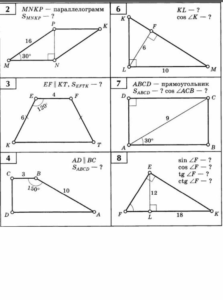8) sinF = 9/√117; cosF = 6/√117; tgF = 3/2; ctgF = 2/3. Здесь тоже используем формулы приведения, но сначала найдем длину EK. EK = √(144 + 324) = √468 = 2√117. sinF = cosK = 18/2√117 = 9/√117. cosF = sinK = 12/2√117 = 6√117. tgF = ctgK = 18/12 = 3/2. ctgF = 1/tgF = 2/3.