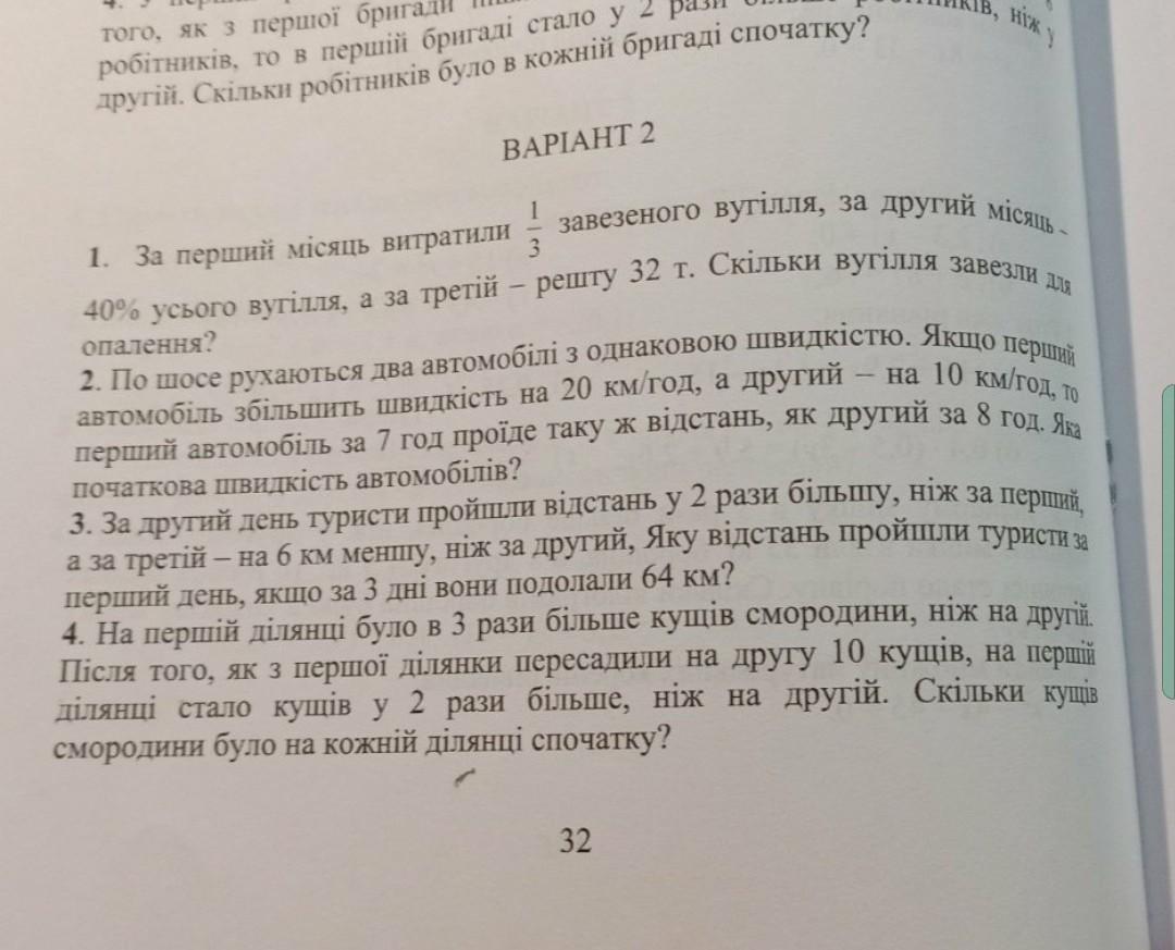 1. За первый месяц потратили-1/3 -завезеного угля, по второй месяц-40% всего угля, а за третий-остальные 32 т.сколько угля завезли для отопления?ЗАДАЧА С ПОМОЩЬЮ УРАВНЕНИЯ