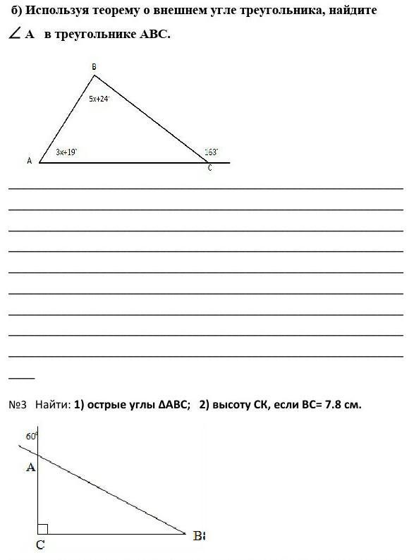 2b. внешний 163=(3x+19)+(5x+24), 8x=120, x=15, уА=64°, уВ=99°, уС=17°