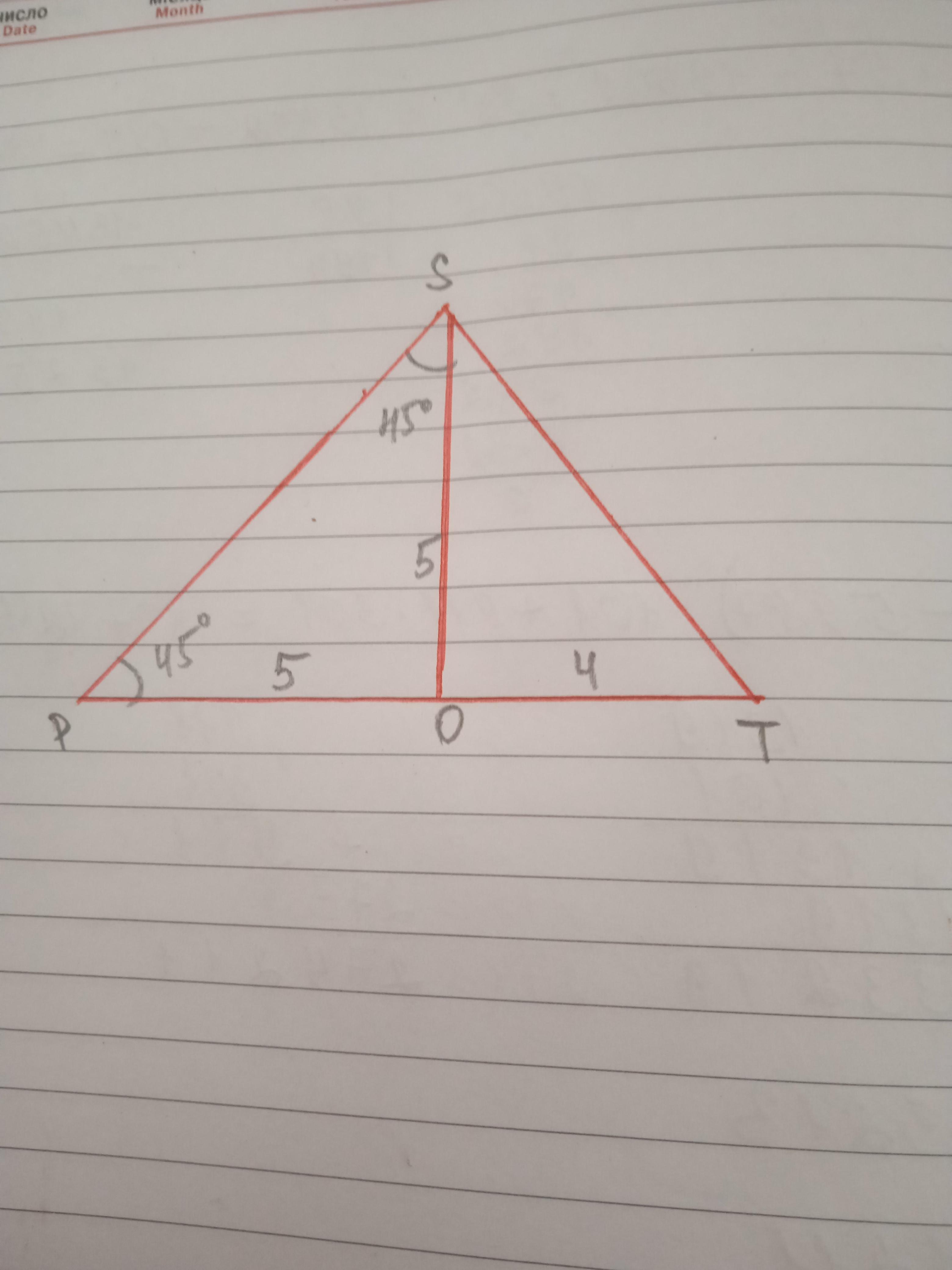 Дано: ΔPST, ∠P=45°, SO - высота, PO=5 см, TO=4 см. Найти S(PST).