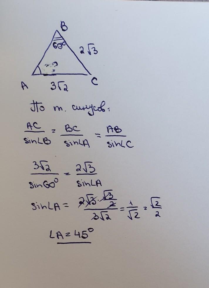 В треугольнике АВС угол В равен 60°, сторона ВС=2√3см, а сторона АС=3√2см. Используя теорему синусов, найдите угол А...