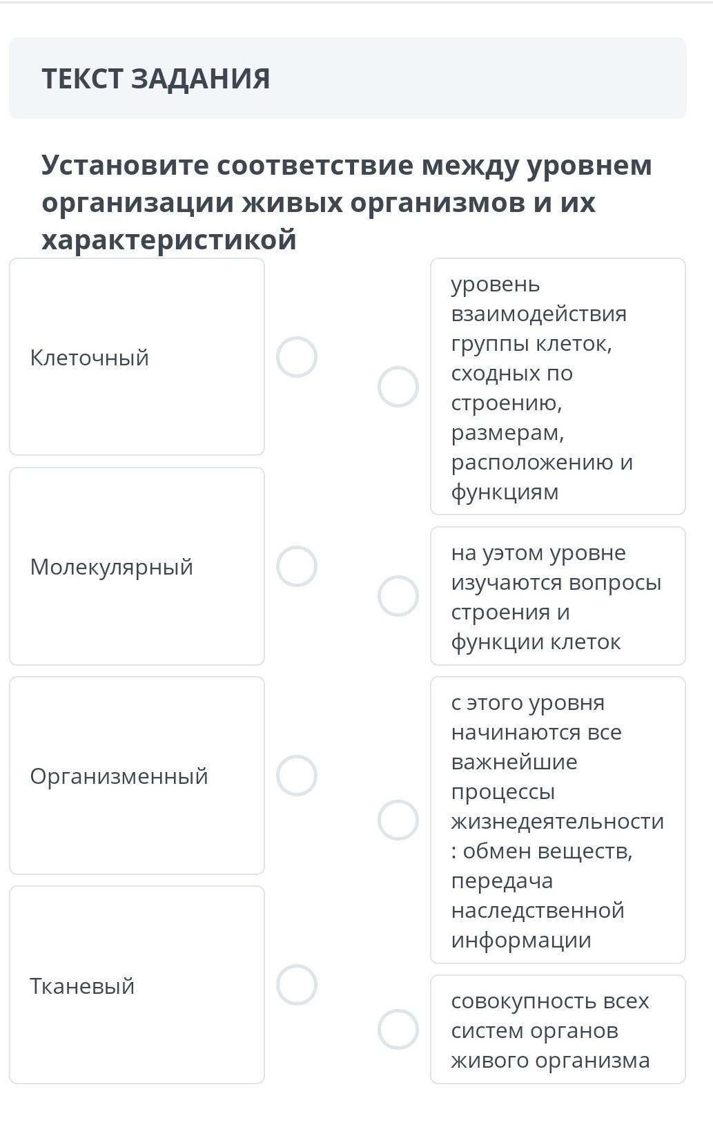 Установите соответствие между уровнем организации живых организмов и их характеристикой. Помогите пожалуйста дам 15 баллов за не правильный ответ бан
