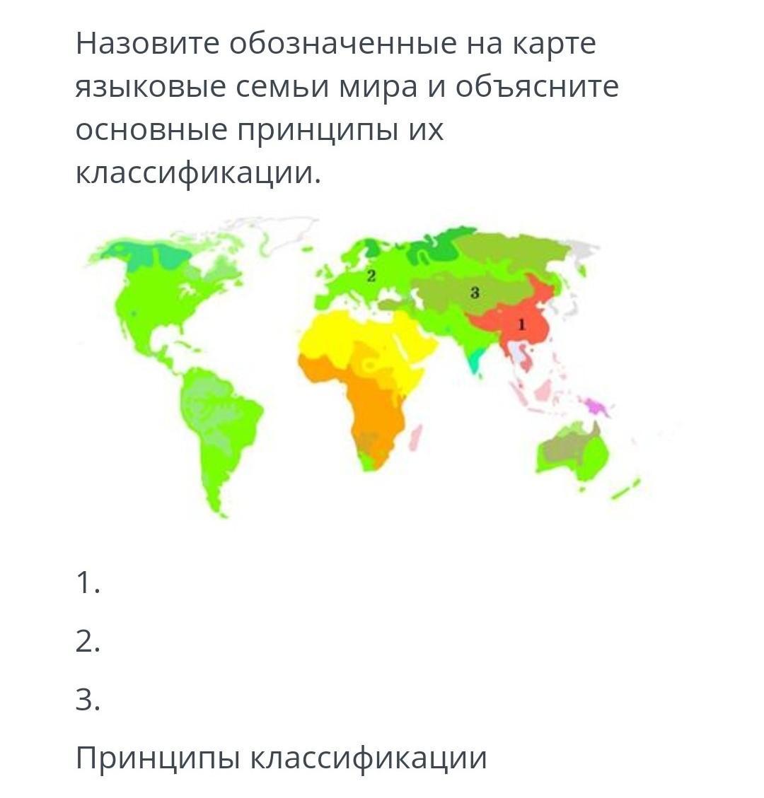 Пожалуйста Назовите обозначенные на карте языковые семьи мира и объясните основные принципы их классификации. 1. 2. 3. принципы классификации