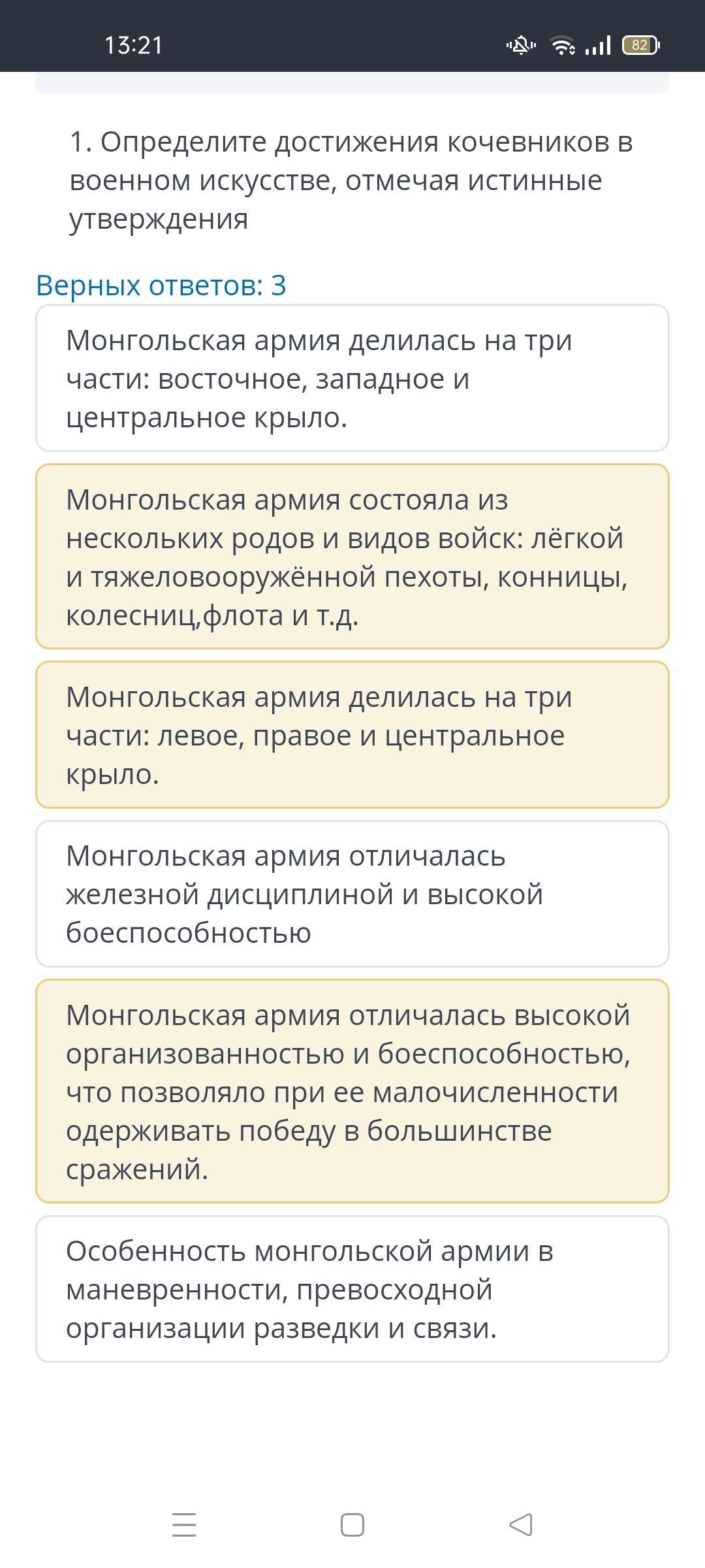 1. Определите достижения кочевников в военном искусстве, отмечая истинные утверждения