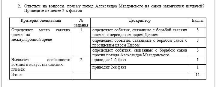 2. Ответьте на вопросы, почему поход Александра Мкедонского на саков закончился неудачей? Приведите не менее 2-х фактов Критерий оценивания Определяет место сакских племен на международной арене Выявляет особенности военного искусства сакских племен Итого Ne задания Дескриптор определяет события, связанные с борьбой сакских племен с персидским царем Дарием определяет события, связанные с борьбой саков с персидским царем Киром определяет события, связанные с борьбой саков против похода Александра Македонского приводит 1-й факт приводит 2-й факт