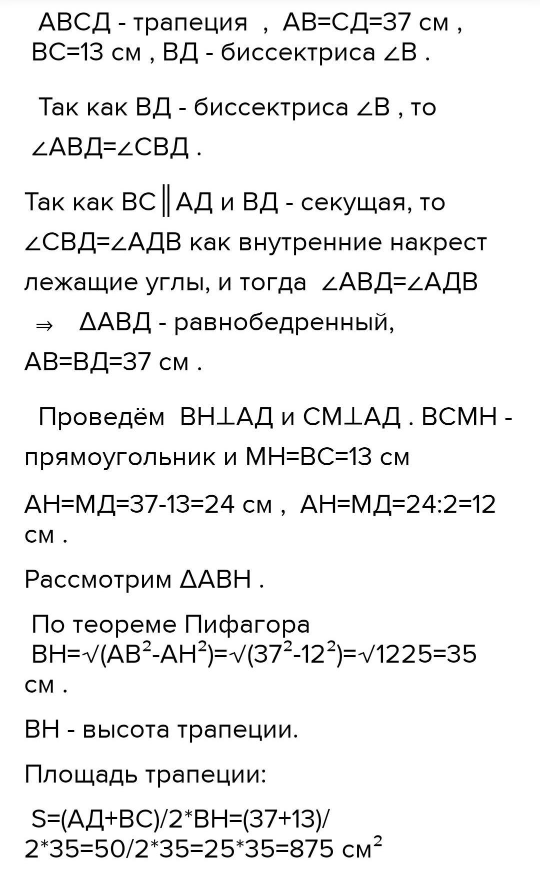В равнобедренной трапеции диагональ является биссектрисой тупого угла. Найдите площадь трапеции, если боковая сторона равна 37 см, а меньшее основание 13см.