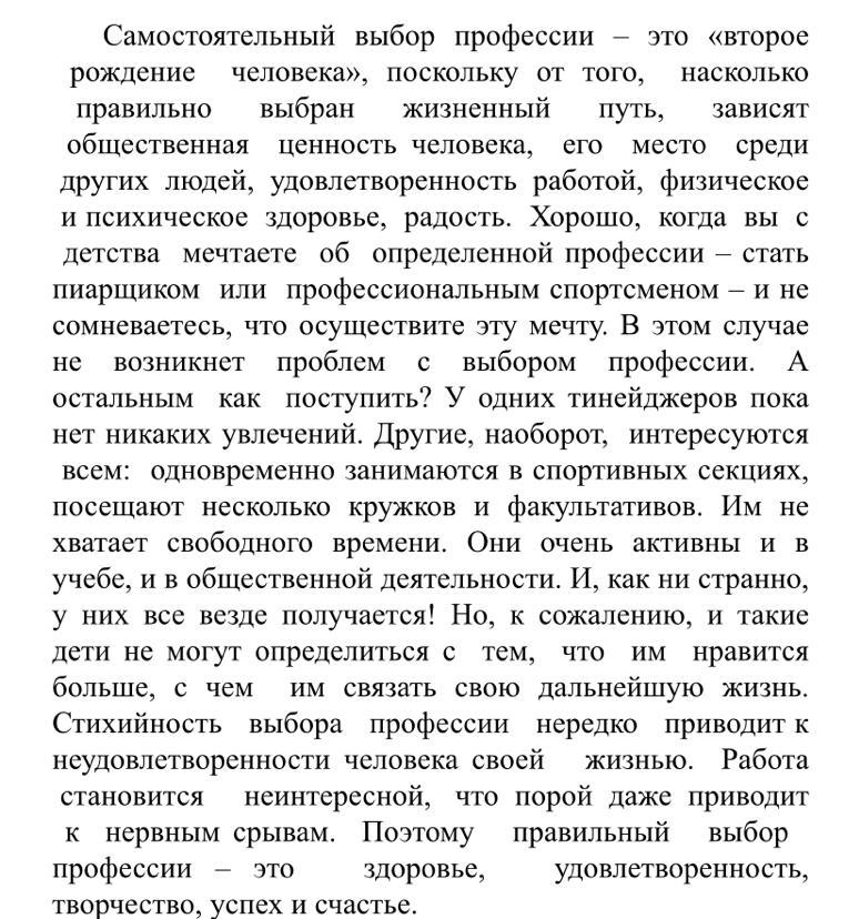 Возможность человеку самому выбрать профессию - очень важно, можно даже сказать, как второе рождение. По выбранной профессии определяется многое, например: психологическое и физическое Здоровье человека, его место среди людей, получение удовольствия от работы, общественные отношения и многое другое. Повезло людям, которые с детства знают чего хотят: стать врачом, пиарщиком или спортсменом. А как же быть остальным? У некоторых вообще нет свободного времени, у других оно в избытке. Первые стараются получить все и сразу. Ходят в разные секции и кружки, посещают семинары, лекции и другие подобные мероприятия. Но, чаще всего, такие дети дольше всего не могут выбрать то, что им нравится больше и то, с чем они хотят связать свою жизнь. Стихийность - не лучший помощник в выборе профессии, это нередко приводит к несчастной жизни, и работа становится в тягость, как и вся жизнь. Выбор профессии - это наше будущее Здоровье, счастье успех и удовлетворенность жизнью.