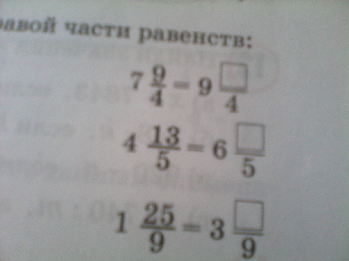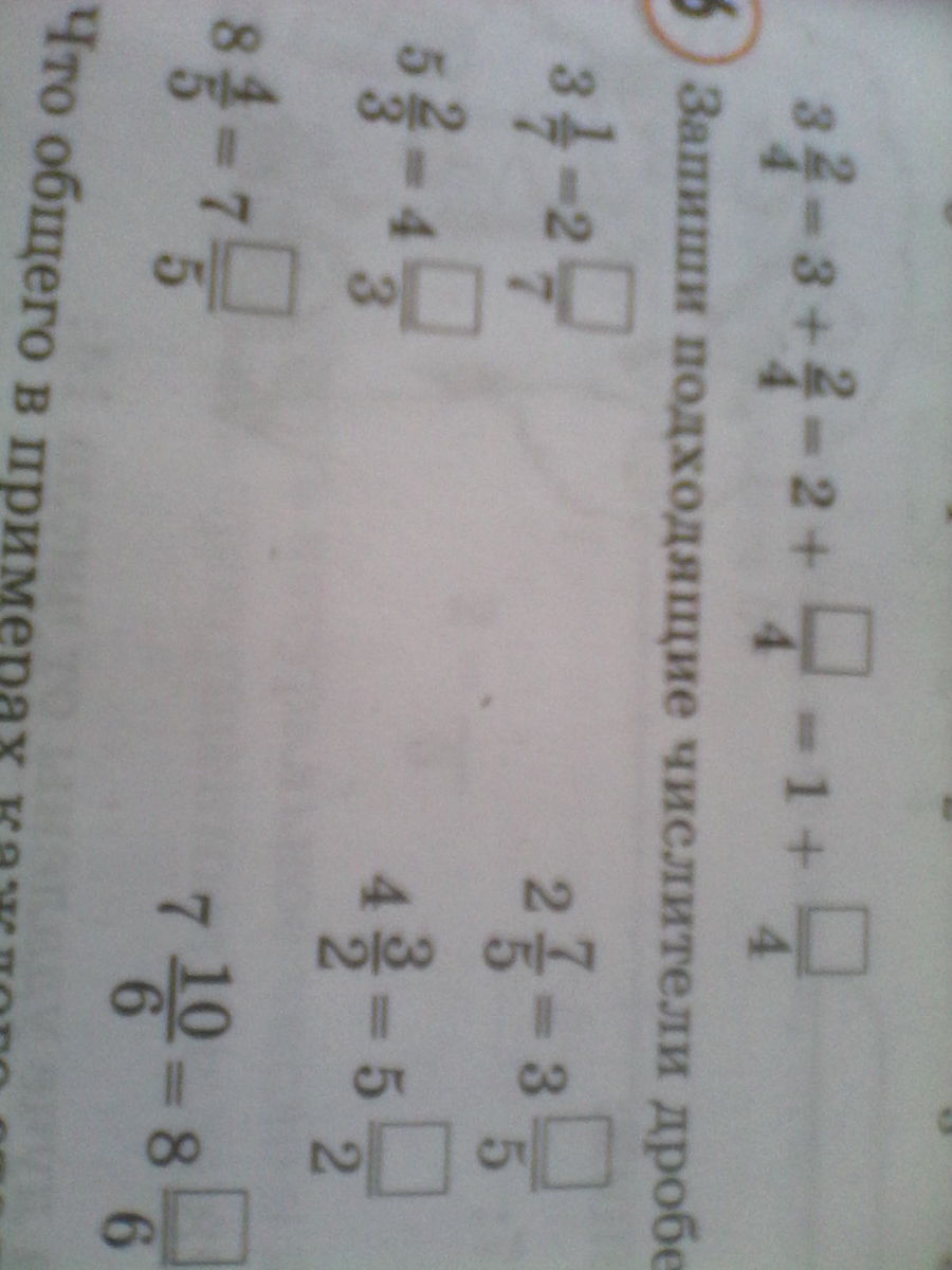 задание: запиши подходящие числители дробей в правой части равенств. что общего в примерах каждого столбика?