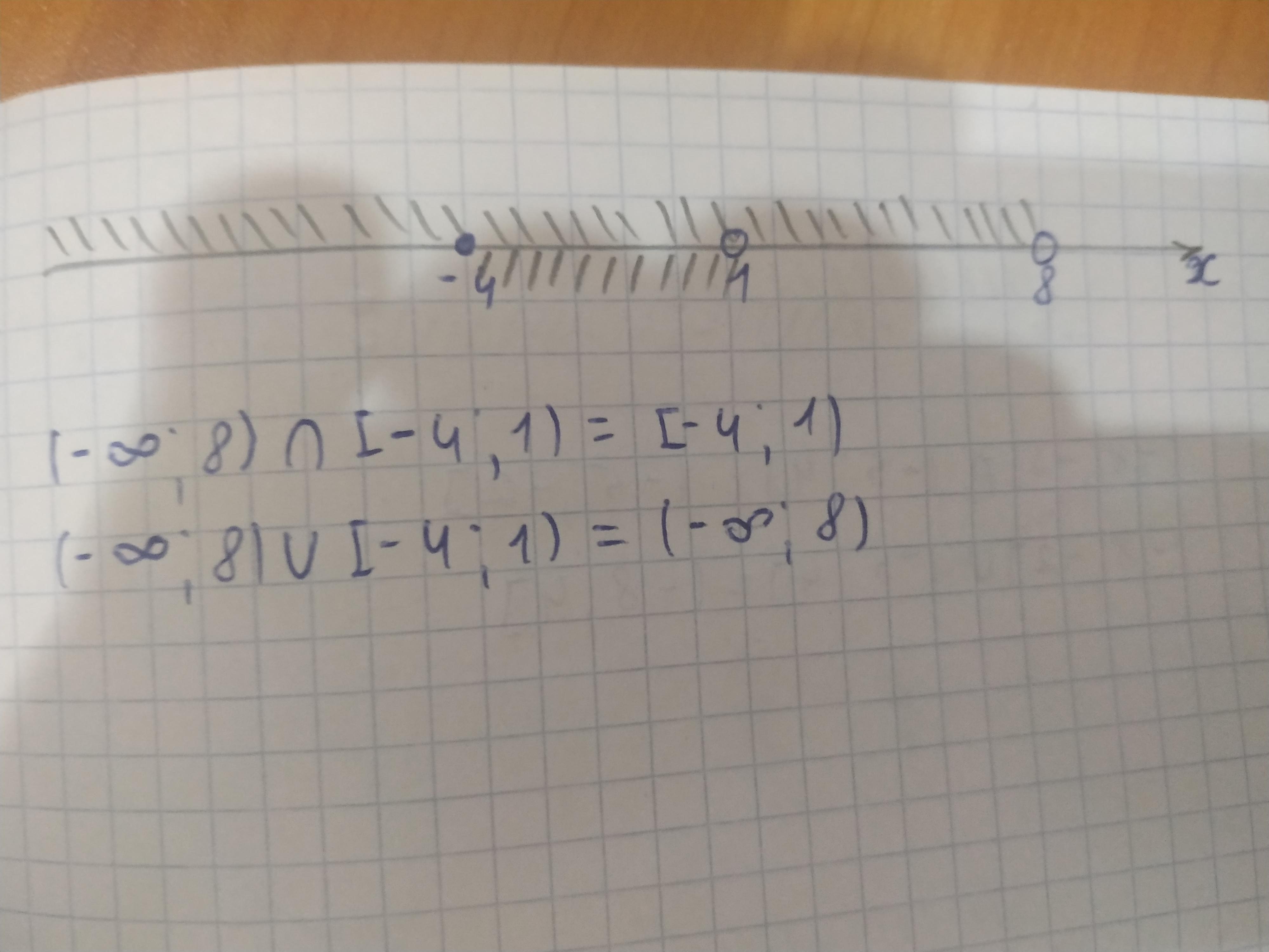 2. Изобразите на координатной прямой и запишите пересечение и объединение числовых промежутков: [-4; 1) и(- ∞;8)