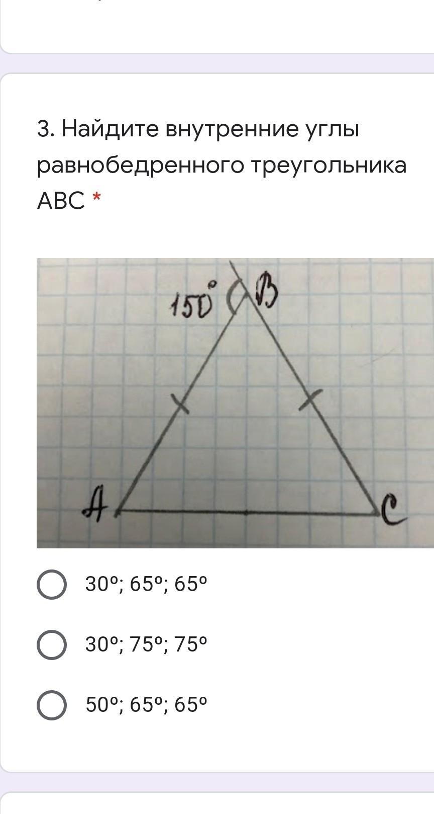 т.к. сумма углов ∆ 180, угол при вершине 30, а углы при основании равнобедренного ∆ = — угол при основании = 75