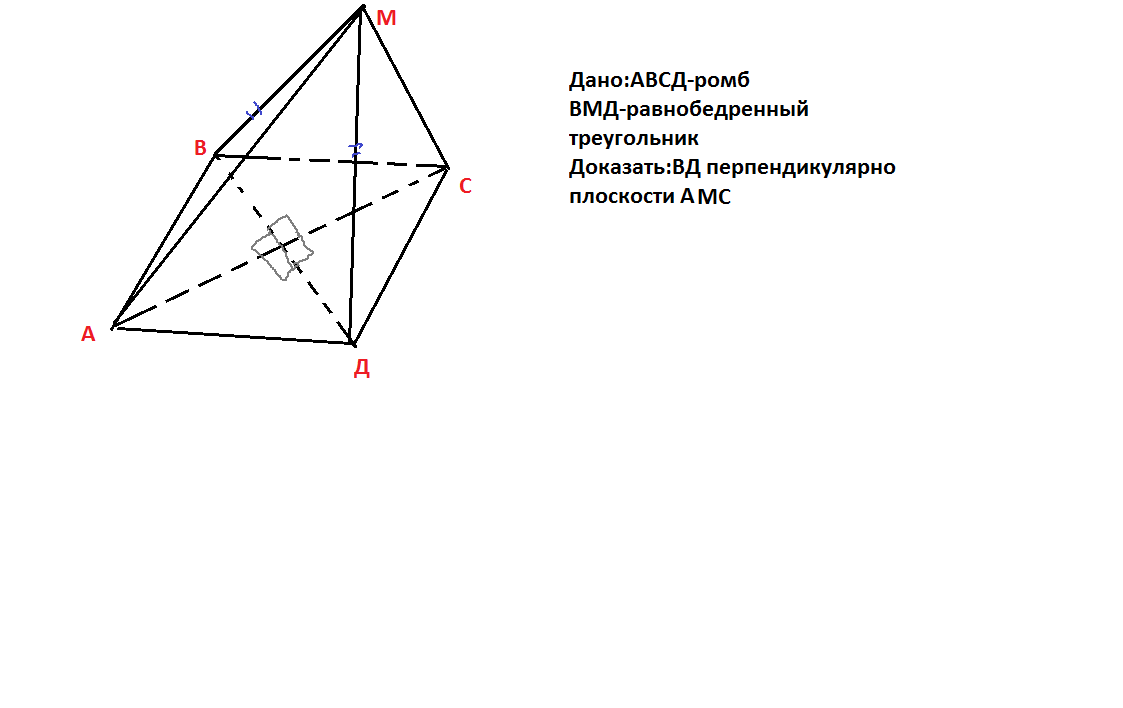 у вас немного перекрученый рисунок, треугольник ВМД равнобедренный, АМС -тоже, МО-высота пирамиды МАВСД, О-пересечение диагоналей=центр вписанной окружности, в треугольникеАМС МО=высота=медиана, МО перпендикулярнаАС, в треугольнике ВМД МО=высота=медиана, ВОперпендикулярна МО, для того чтобы прямая была перпендикулярна плоскости достаточно чтобы она была перпендикулярна к двум прямым которые пересекаются и лежат в этой плоскости, АС пересекается с МО, АС и МО лежат в плоскости АМС, ВО перпендикулярна АС о МО, значит ВО (ВД) перпендикулярна плоскости АМС