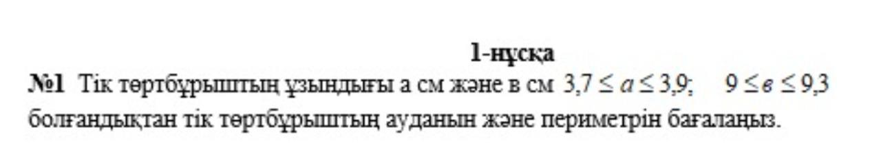 формула периметра, P = 2(a+b)Р_{min} min = 2(3,7 + 9) = 25,4P_{max} max = 2(3,9 + 9,3) = 26,425,4 ≤ P ≤ 26,4формула площади, S = a*bS_{min} min = 3,7 * 9 = 33,3S_{max} max = 3,9 * 9,3 = 36,27