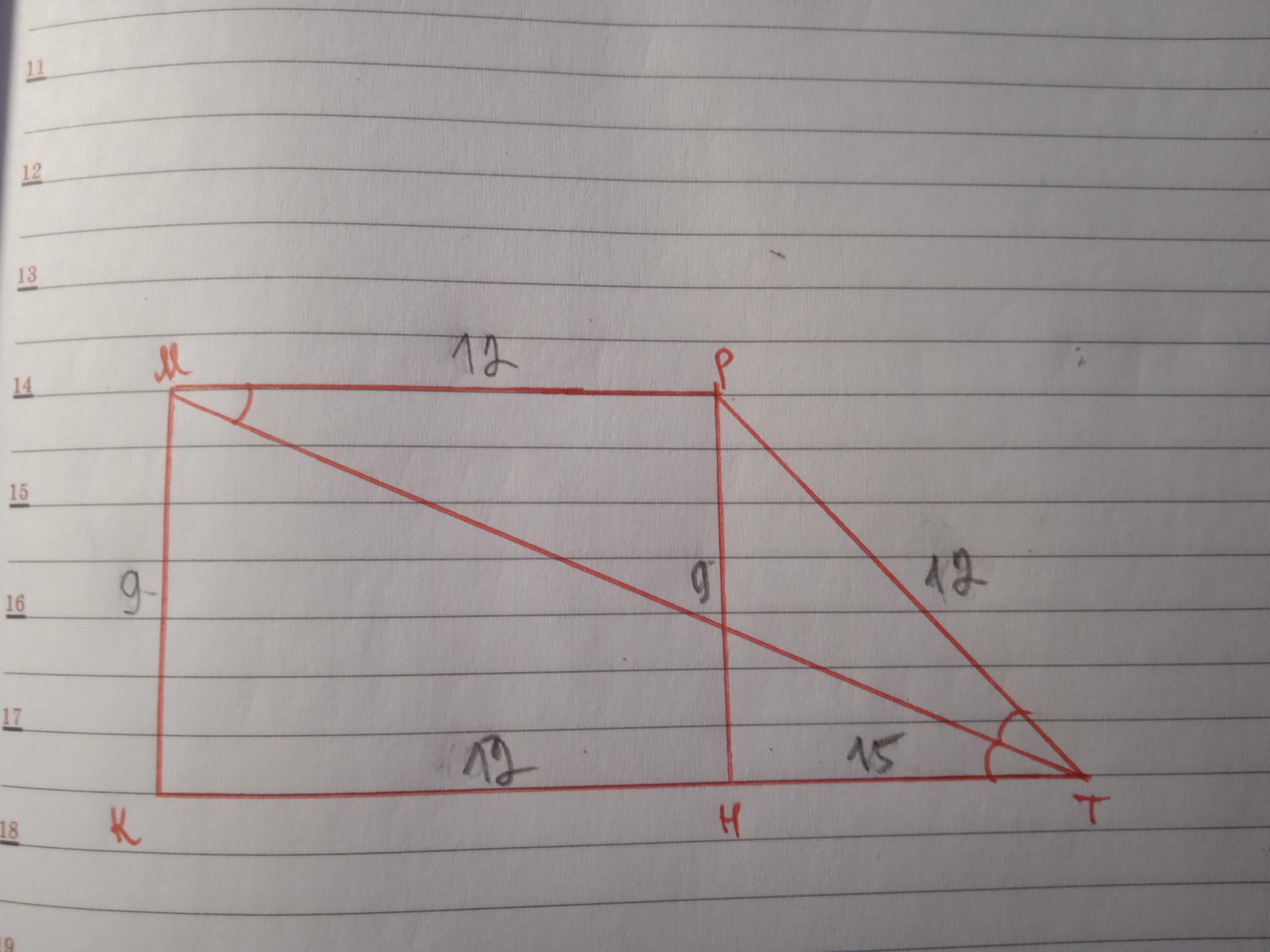 Дано: КМРТ - трапеция, МК⊥КТ, МК=9 см, РТ=12 см. МТ - биссектриса. Найти S(КМРТ).
