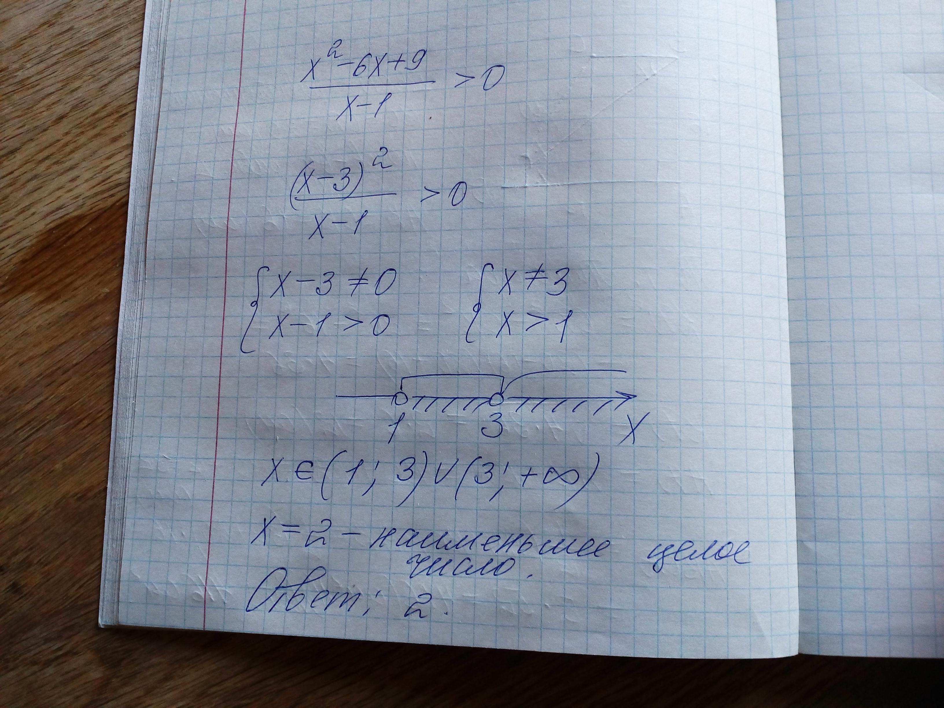 Решите неравенство и укажите наименьшее целое число, удовлетворяющее неравенству: (x^2-6x+9)/(x-1)>0
