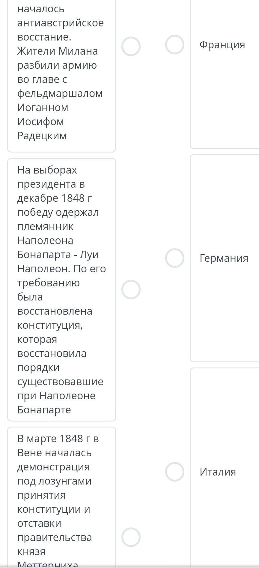 Соотнесите страны и события, в которых данные события произошли в марте 1848года в Ломбардии и Венеции началось