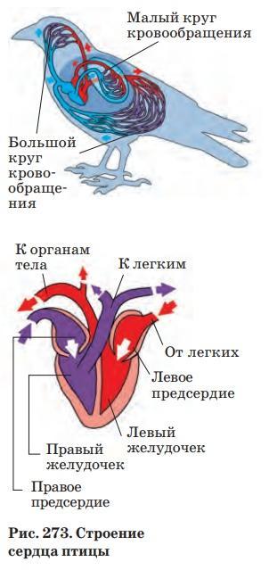 У птиц в сердце 4 камеры ( 2 предсердия и 2 желудочка), 2 круга кровообращения. От левого желудочкка отходит правая дуга аорты.