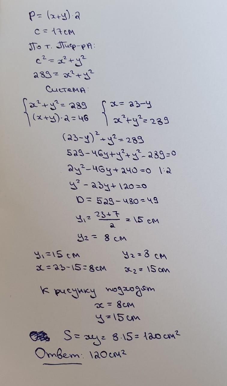 Периметр прямоугольника равен 46 см, а его диагональ – 17 см. Найди площадь прямоугольника.