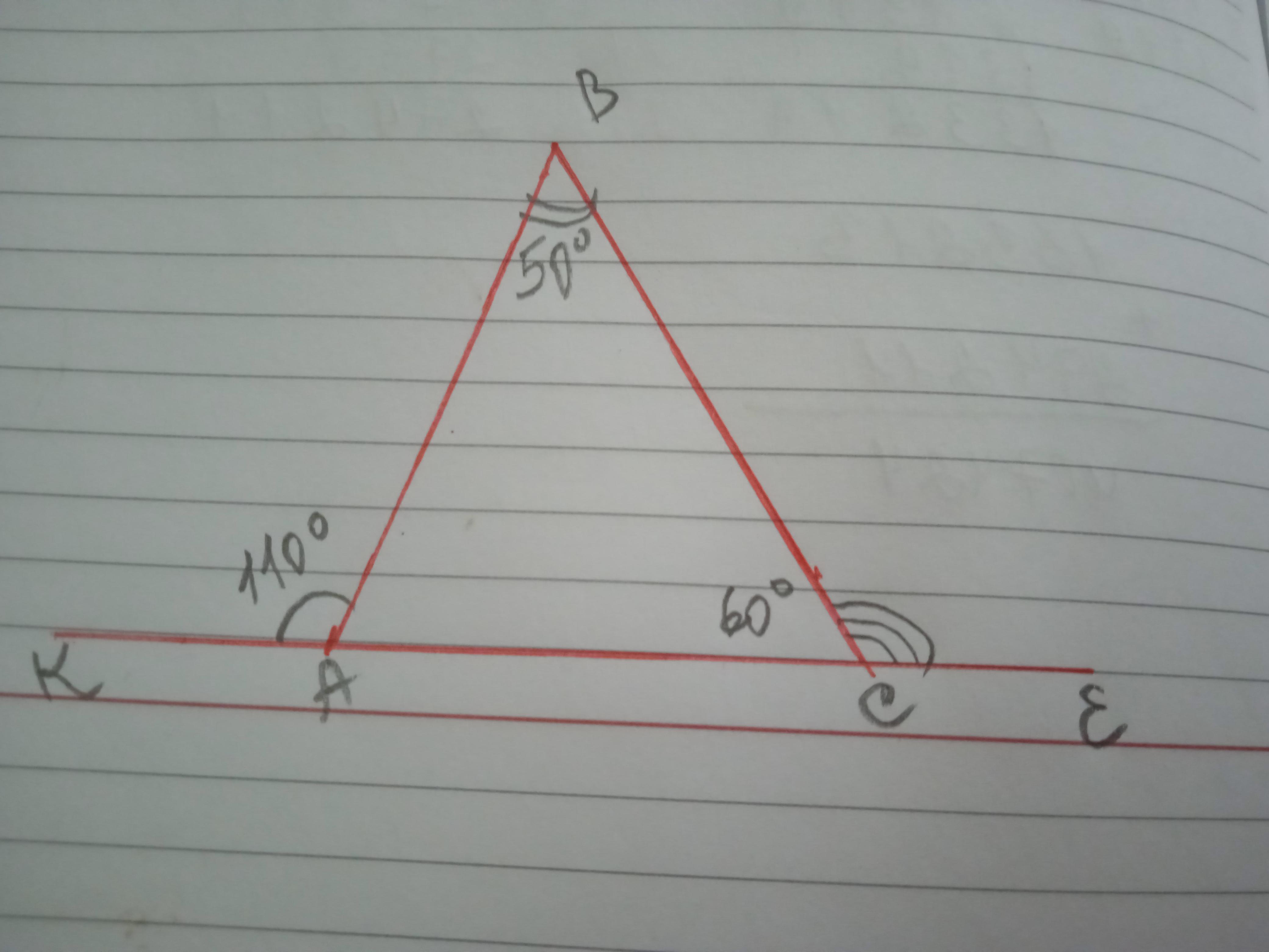 Дано: ΔАВС, ∠В=50°, ∠КАВ=110°. Найти ∠ВСЕ.