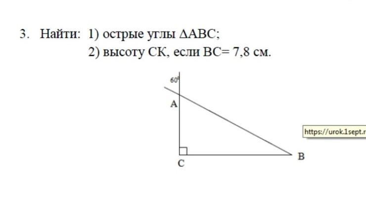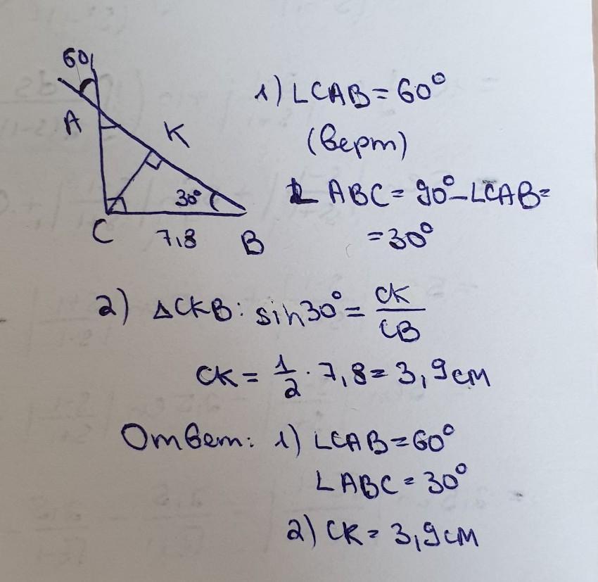 Треугольник СКВ -прямоугольный, угол В=30 градусов, значит СК=1/2*7,8=3,9 см