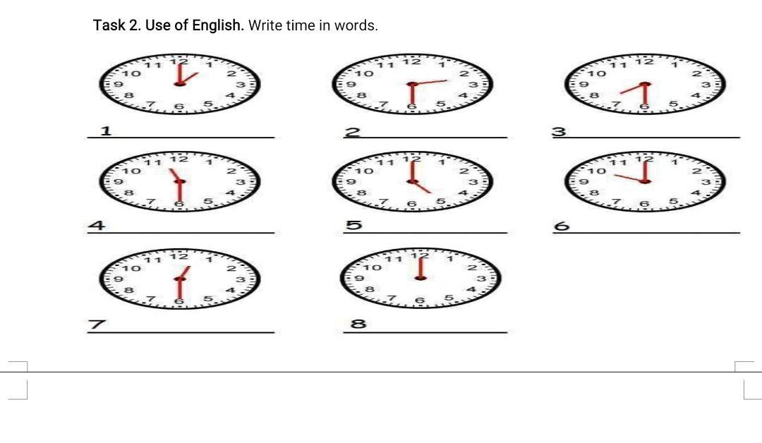 1. one o'clock.2.half past three o'clock.3.half past eight o'clock.4.half past twelve.5.five o'clock.6.ten o'clock.7.half past one .8. twelve o'clock
