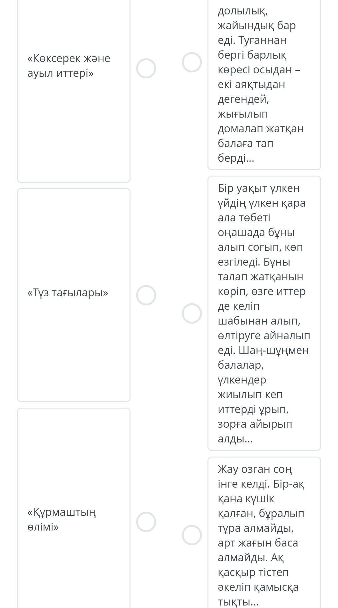 М.Әуезовтің « Көксерек » әңгімесі бойынша бөлімдер мен олардың сюжеттік бөлшектерін сәйкестендіріңіз
