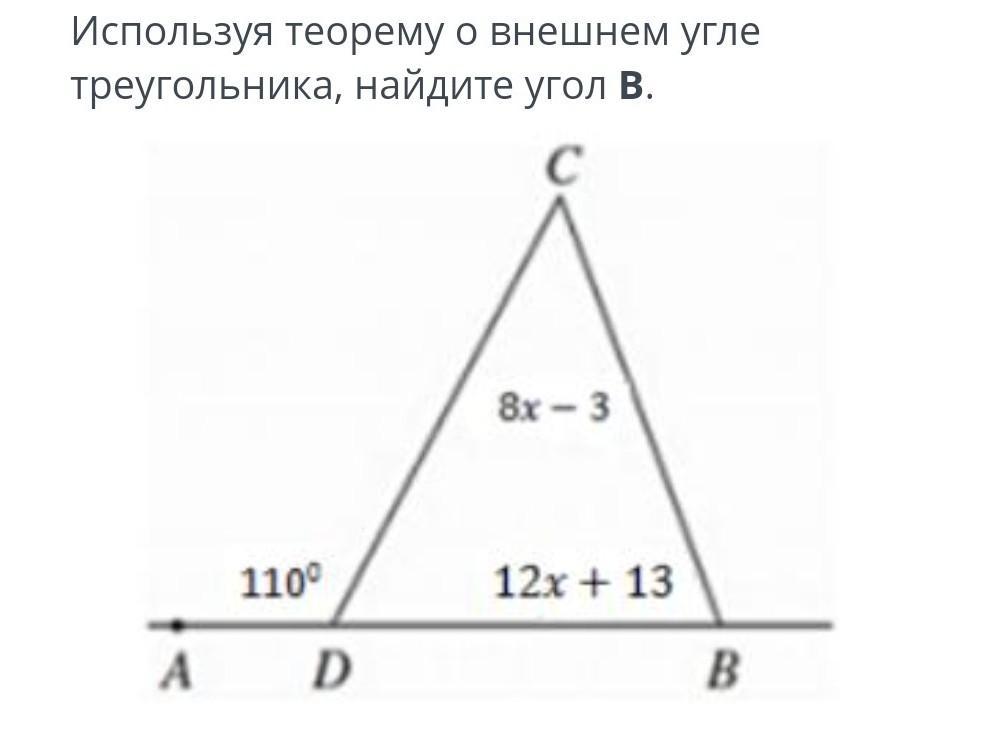 Внешний угол треугольника равен сумме двух оставшихся углов треугольника, не смежных с этим внешним углом.