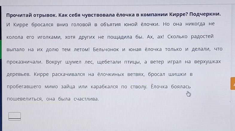 Ёлочка когда увидела Кирре, хотела пошевельнуться. Но не смогла, потому-то Ёлочка была вся в игрушках и леденцах. Она была очень рада что наконец увидела Кирру. Она думала что он пропал навсегда. Так и прошёл весёлый Новый год.