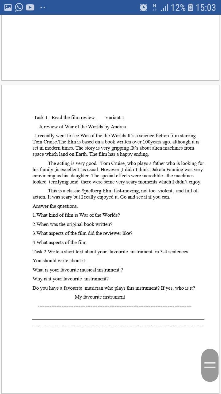OTMEHNTÜ OTBET • 8 5AMNOB © Hl 12% 15:03, Завдання 1: Прочитайте огляд фільму. Варіант 1 Огляд "Війни світів" Андреа I нещодавно відвідав фільм "Війна світів". Це науково-фантастичний фільм за участю Тома Круза. Фільм заснований на книзі, написаній понад 100 років тому, хоча подія відбувається в сучасний час. Історія дуже захоплююча. Це про інопланетні машини з космосу, які приземляються на Землю. Фільм має щасливий кінець. Акторська гра дуже хороша. Том Круз, який грає батька, який шукає свою сім'ю, чудовий, як завжди. Однак я не думав, що Дакота Феннінг була дуже переконливою, як його дочка. Спецефекти були неймовірними - машини виглядали жахливо, і траплялися дуже страшні моменти, які мені не сподобались. Це класичний фільм Спілберга: швидкий, не надто бурхливий і насичений діями. Це було страшно, але мені це дуже сподобалось. Піди і подивись, якщо зможеш. Дайте відповіді на запитання. 1. Яким фільмом є Війна світів? 2. Коли була написана оригінальна книга? 3. Які аспекти фільму сподобались рецензенту? 4. Які аспекти фільму Завдання 2 Напишіть короткий текст про ваш улюблений інструмент у 3-4 речення. Вам слід написати про це: Який ваш улюблений музичний інструмент? Чому це ваш улюблений інструмент? У вас є улюблений музикант, який грає на цьому інструменті? Якщо так, то хто це? Мій улюблений інструмент ||