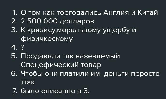 4. Прочтите текст, ответьте на вопросы. Уже в конце XVIII века англичане вели широкую торговлю этим специфическим товаром, занимаясь до предела, превышающим весь объем английской стороны с Китаем. И если раньше европейцы были вынуждены щедро платить за серебро за чай, шелк, фарфор и другие популярные товары европейской элиты, китайские товары, то поток серебро (основная в мире расчетная валюта) коптили наоборот. «Nourished Ost» - индийская компания, безуспешно запрещенная центральным правительством в Пекине, торговля опиумом неуклонно поднималась до уровня 1816 года. уже выражена в сумме около 2 500 000 долларов. В 1820 г. количество ящиков, ввезенных контрабандой в Китай, достигло 5147 в 1821 году. - 7000, а в 1824 г. - 12639. Ввиду экономического удара торговля опиумом в таких гигантских масштабах нанесла ужасный удар моральному и физическому состоянию всего китайского народа. Открыто продвигая свободную торговлю ядом, британское правительство тайно защищает свою монополию на производство. Какое событие описано в этом документе? Как китайцы платили за опиум, что способствовало резкому ухудшению китайской экономики? [1] К каким изменениям он привел торговлю опиумом в Китае? Приведите не менее 2-х примеров. [2] Какие меры принимало китайское правительство в борьбе с незаконным оборотом наркотиков? Приведите не менее 2-х примеров. [2] Какими принципами руководствовались представители европейских государств в торговле? Какую конечную цель преследовали европейцы в отношениях с Китаем? Каковы последствия этих событий для Китая? (не менее 2 - х) [2]