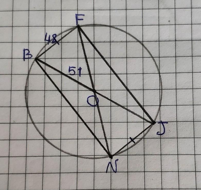 На окружности с центром в точке O по порядку отмечены 4 точки: B, F, J, N. Найди вторую сторону получившегося четырёхугольника, если BF∥NJ,BF=NJ, радиус этой окружности 51 см, а BF=48 см.