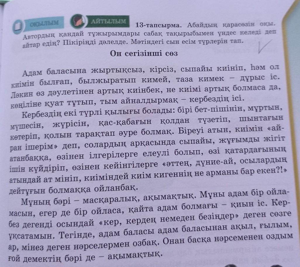 оқылым АЙТЫЛЫМ 13 - тапсырма . Абайдың қарасөзін оқы . Автордың қандай тұжырымдары сабақ тақырыбымен үндес келеді деп айтар едің ? Пікіріңді дәлелде . Мәтіндегі сын есім түрлерін тап .